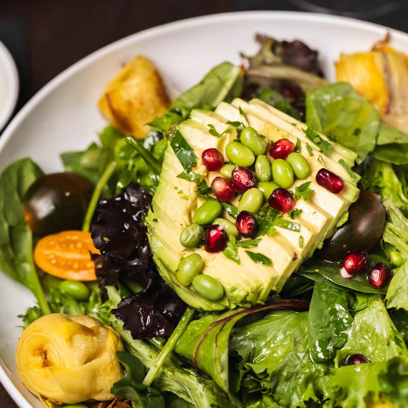 Mix green, fresh avocado, cherry tomatoes, parsley, artichoke hearts, edamame, and lemon-olive oil dressing.