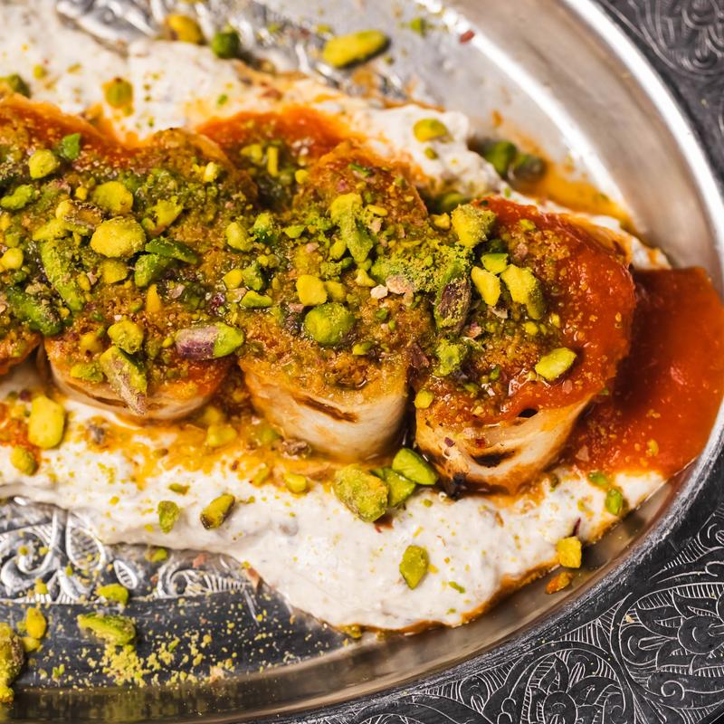 Beef & lamb, sautéed eggplant, kashkaval cheese. Topped with Greek yogurt, tomato-based sauce, and pistachios.