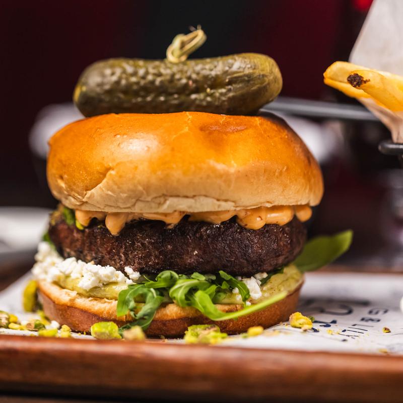 Wagyu beef burger, pistachio, arugula, feta cheese, mayonnaise, harissa, pickles, shoestring fries.