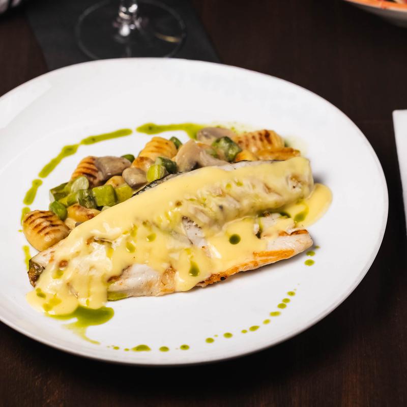 Char-grilled fillet branzino, toasted gnocchi with asparagus & mushroom lemon butter sauce.