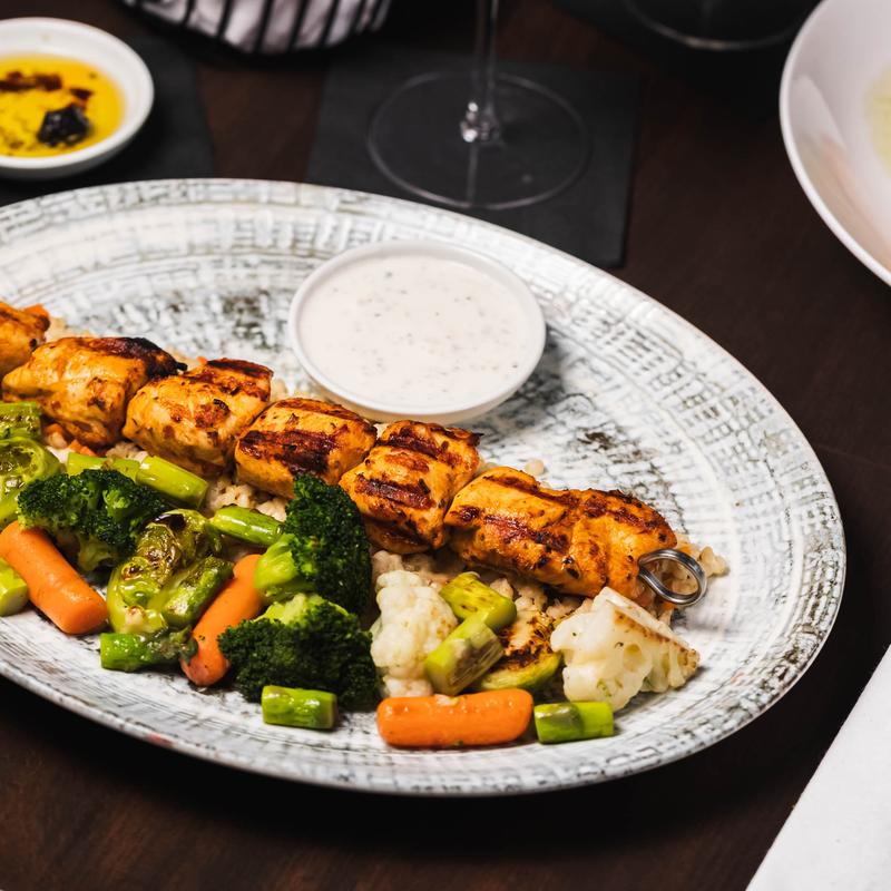 Char-grilled chicken chops, orzo-veggie rice, grilled vegetables, and mint chutney.