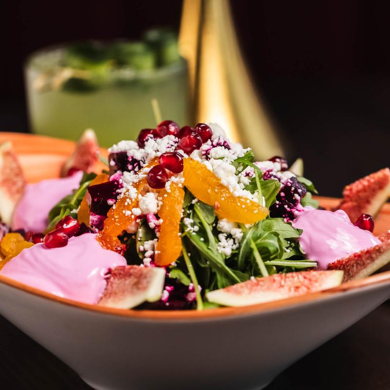 Fresh baby arugula, fresh beets, dried Turkish apricots, pine nuts, fresh figs, and goat cheese crumbles. Served with house dressing and whipped goat cheese.