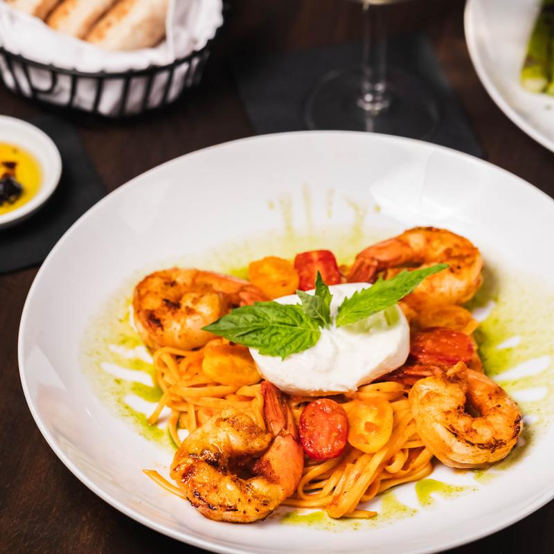 Spicy chili-tomato butter with garlic, basil, and grilled shrimp. Topped with a soft burrata.
